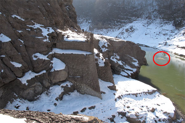 橋脚脇の川岸から。右が御判石で左が万歳橋の橋脚に使われた石だ。記事の写真を見ると、もっと水量が少なければ、御判石と橋脚石に向かって堆積した砂利で高くなっている部分があり、床板の落ちた橋梁の街道跡遺構の向う側によじ登らなくても近くに行けたようだ。