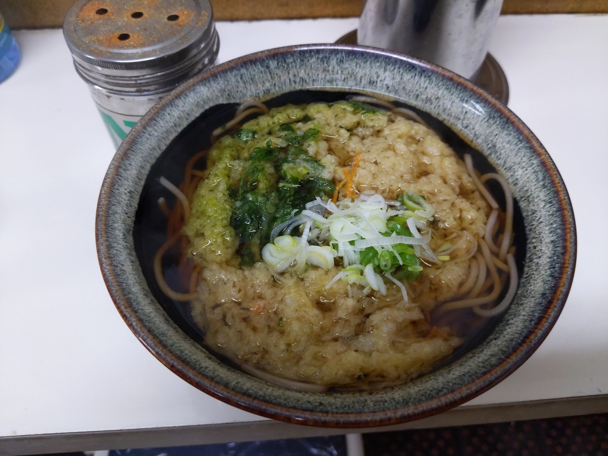 天ぷらそば390円。「さかえや」的な天ぷら、これはこれでつゆでくずれたグズグズ感がたまらん坂。